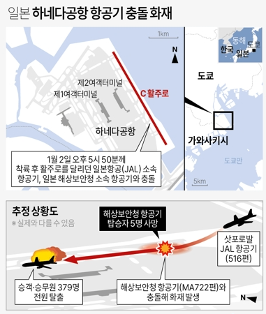사고원인은 활주로에 있던 해상보안청 소속 항공기 MA722편과 충돌한것으로 전해지고 있고 안타깝게도 해당 항공기에 탑승해 있던 총 6명 중 기장을 제외한 5명 모두 사망 한 것으로 전해지고 있습니다.