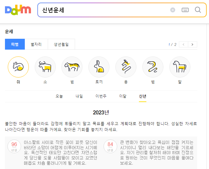 다음 사이트에서 키워드를 '신년운세'로 하고 검색을해 아래로 조금만 스크롤을 내리면 운세 란이 있는데요.